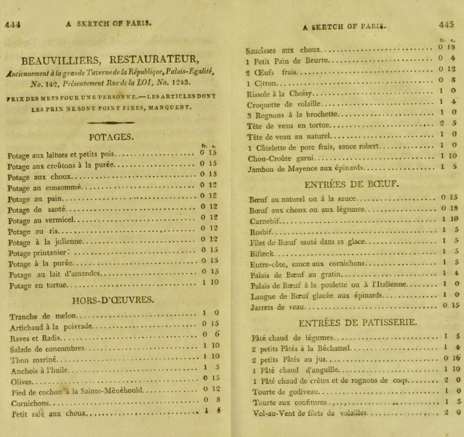 Jules stared at the printed sheet. “Not as extensive as that of Le Beauvilliers but far better prices.”